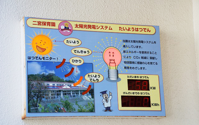 平成15年には次代を担う子どもたちに少しでも良い環境を伝える一助になる事を願い、保育園の屋根に太陽光発電を設置しました。